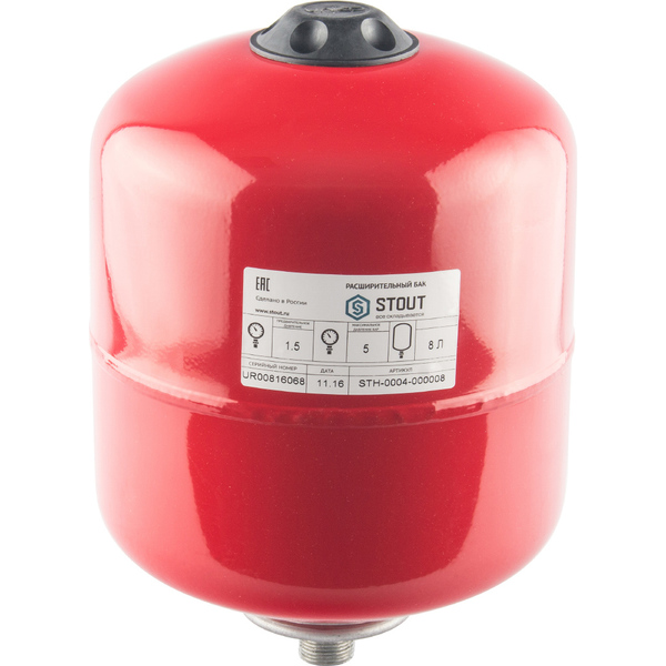 Внутреннее пространство всех элементов системы отопления (трубопроводов, отопительных приборов, арматуры, оборудования и т. д.) заполнено водой. Получающийся при заполнении объём воды в процессе эксплуатации системы претерпевает изменения: при повышении температуры воды он увеличивается, при понижении — уменьшается. Соответственно изменяется внутреннее давление. Однако эти изменения не должны отражаться на работоспособности системы отопления и, прежде всего, не должны приводить к превышению предела прочности любых её элементов. Поэтому в систему водяного отопления вводится дополнительный элемент — расширительный бак Stout WRV 8 литров.