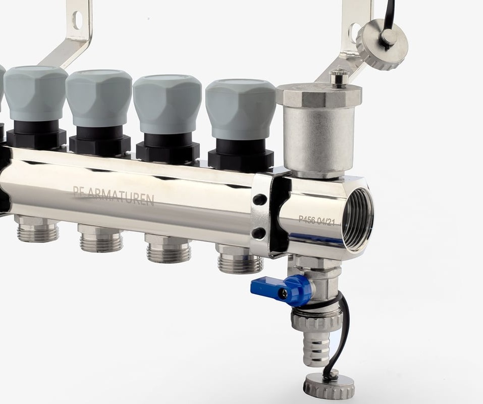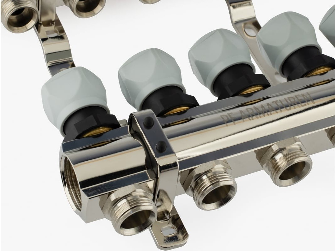 Коллекторная группа состоит из подающего и обратного коллекторов (гребенок), смонтированных на звукоизолирующих кронштейнах, согласно DIN 4109-1989. Кронштейны изготовлены из оцинкованной конструкционной стали S235JR (DIN EN 10025-2005). Подающий коллектор оснащен ручными регулировочными клапанами с расходомерами с одной стороны и переходными ниппелями с другой стороны. Подающая гребенка имеет возможность отключения каждого отдельного циркуляционного контура системы. Обратный коллектор снабжен запорными клапанами для плавного перекрытия потока и переходными ниппелями. Запорные клапаны могут быть автоматизированы с помощью электротермического привода (резьба подсоединения М30х1.5). Каждая из гребенок имеет внутреннюю цилиндрическую резьбу 1" или 1 ¼" для присоединения к трубопроводу и 6 отводов по бокам c настроечными или запорными клапанами. Все трубные цилиндрические резьбы соответствуют DIN 259 (ISO 228-1, ГОСТ 6357). Присоединение циркуляционных контуров осуществляется к переходным ниппелям с помощью фитингов «евроконус» ¾". Расстояние между центрами отводов — 50 мм. Коллекторные группы моделей комплектуются дополнительно двумя автоматическими воздухоотводчиками и двумя дренажными шаровыми кранами, по одному на подающий и обратный коллектор. Соединения всех элементов коллекторной группы между собой выполнены с помощью уплотнительных колец, изготовленных из EPDM, и герметизированы клеем. Это позволяет отказаться от использования дополнительных герметизирующих и уплотнительных материалов.