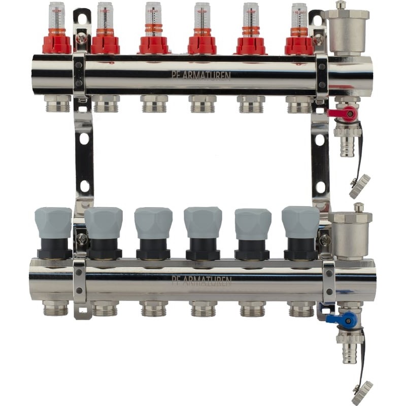 Блок коллекторный с расходомерами 1 х 3/4 6 вых. ProFactor PF MB 802.6 - используются в системах водоснабжения, водяного радиаторного или напольного отопления для распределения и регулирования рабочей среды в системе. Каждая труба системы водоснабжения, отопительной системы водяного отопления или теплого водяного пола подключается к коллектору, что позволяет осуществлять регулировку и контроль потока теплоносителя индивидуально в каждом циркуляционном контуре. Коллекторная группа может использоваться на трубопроводах, транспортирующих жидкие среды, неагрессивные к материалам изделия (вода, антифриз на основе этиленгликоля). Максимальное содержание этиленгликоля в антифризе — 30%. Антифриз следует применять, если характеристики системы предполагают температуру носителя ниже 0°С.