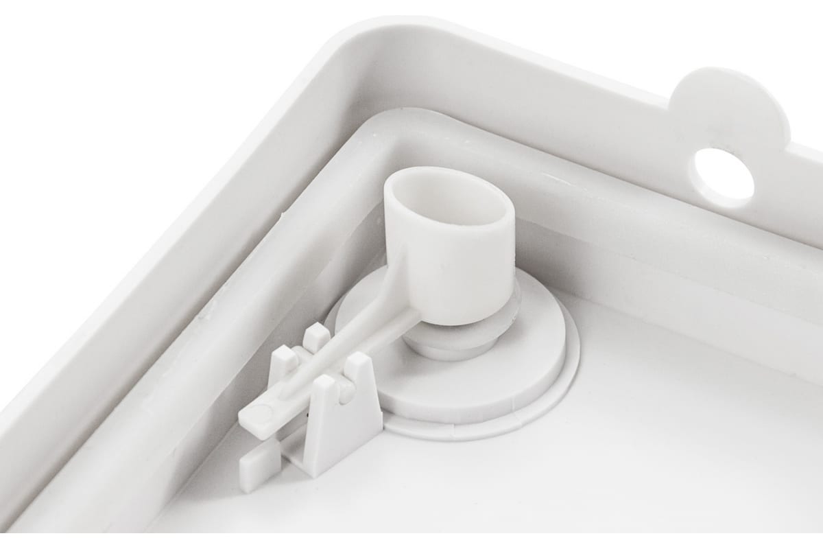 Имеет два входа, которые позволяют подключать агрегат к раковине и душу. Корпус выполнен из легкого пластика. Внутри установлен центробежный насос с рабочим колесом. Обратный клапан предотвращает возврат откаченной воды в станцию.