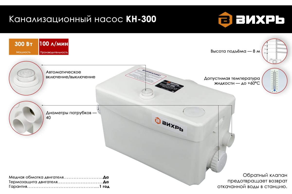 Канализационная установка Вихрь КН-300 отличается компактными размерами, что позволяет разместить его в ограниченном пространстве. Предназначен для использования в частных домах и на даче. На корпусе расположены 3 патрубка диаметром 40 мм, позволяющие отводить воду из умывальника, стиральной машины, душевой кабины, но данная модель не оснащена выходом под туалет. Обратный клапан не позволяет откачанной жидкости попадать в насос, исключает возникновение неприятного запаха.
