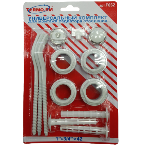 Комплект пробок 3/4 (с 3 кронштейнами) TERMO-RM - предназначенный для монтажа алюминиевые и биметаллических радиаторов отопления с присоединительным размером 1". В комплекте 4 пробки, 2 с левой резьбой и 2 с правой резьбой, 1 заглушка, 1 воздухоотводчик и ключ для него, 3 кронштейна и дюбели для крепления радиатора к стене. Футорки снабжены силиконовыми прокладками. Кронштейны, как и футорки выполнены из оцинкованной стали, окрашены белой (RAL 9010) эпоксидной эмалью. В качестве теплоносителя в системе может применяться как вода, так и незамерзающая жидкость.