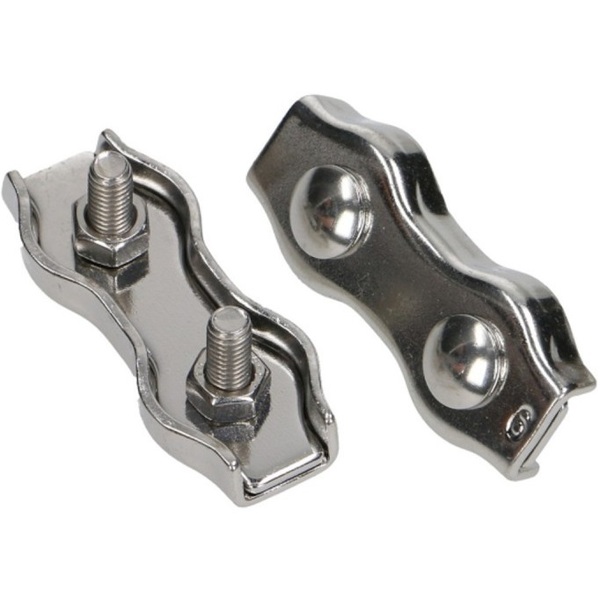 Зажим нержавеющий 3мм (двойной) для троса позволяет быстро сращивать металлические канаты, тросы, формировать из них петли любого размера. Отличается высокой надежностью, выдерживает большие деформационные усилия, не разрушается даже при предельных нагрузках. В конструкцию входит изогнутая в форме буквы U скоба, на концах которой расположена резьба, фиксирующаяся гайками. Между скобой и колодкой образуется кольцо, в которое продевается канат (трос). При завинчивании гаек трос надежно фиксируется в проушине.