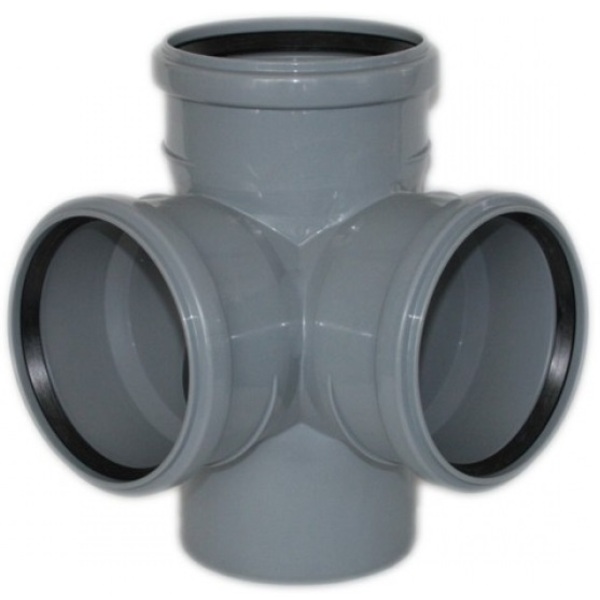 Крестовина канализационная, применяется в системах канализации для подключения дополнительных коммуникационных ответвлений от стояка системы и стыковки труб между собой.