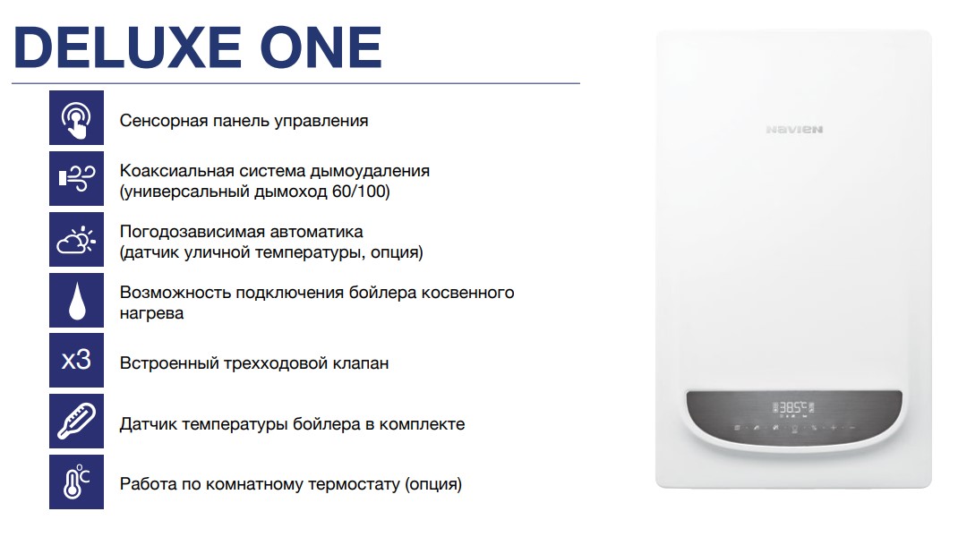 Navien DELUXE ONE-24k является одноконтурным газовым котлом, который рассчитан на обогрев дома средней площади. Данная модель оснащена встроенным трехходовым клапаном, который делает абсолютно простым и удобным подключение бойлера косвенного нагрева для обеспечения системы горячего водоснабжения. Управление работой котла осуществляется при помощи сенсорной панели управления с возможностью просмотра журнала ошибок и погодозависимым регулированием