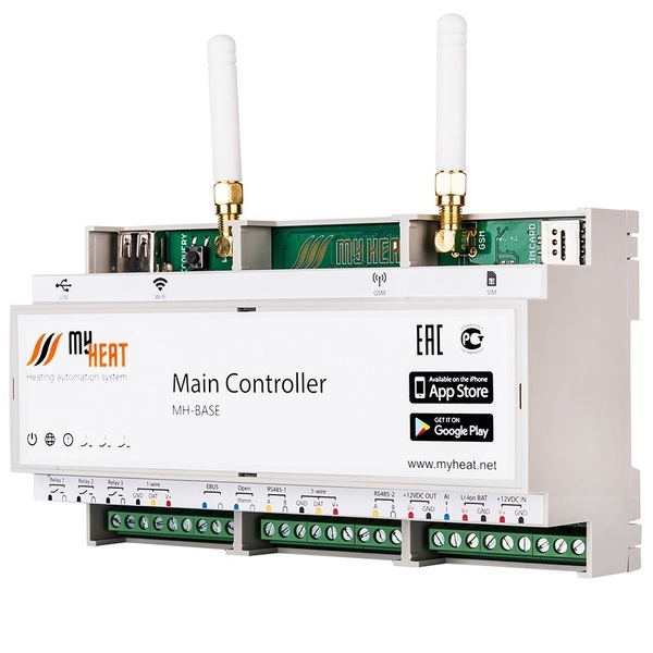 Контроллер MY HEAT Base - Предназначен для управления сложными системами отопления и горячего водоснабжения в частных домовладениях и небольших предприятиях. Осуществляет управление каскадом до 6-ти котлов, бойлером косвенного нагрева, насосами, смесительными узлами, трех- и двухходовыми клапанами, позволяя регулировать температурные режимы в 64 зонах. Обеспечивает удаленны й контроль всех параметров системы отопления, а также SMS и Push оповещение, в случае возникновения ошибок.