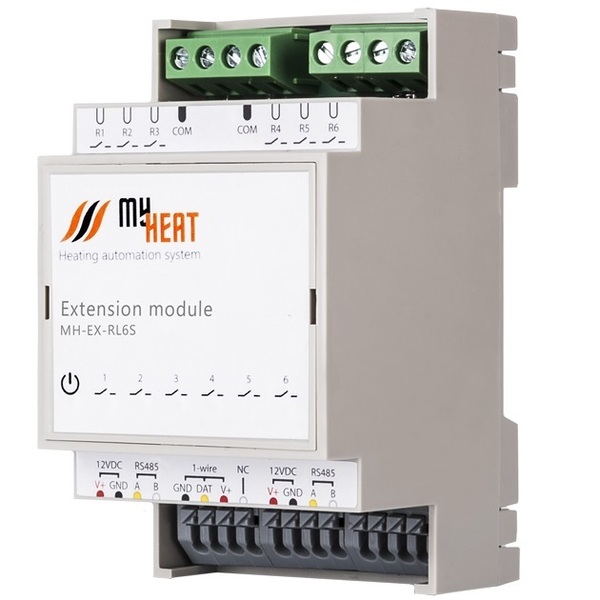 Модуль расширения MH-EX-RL6S - Модуль подключается к контроллеру по проводной шине и предназначен для бесшумной коммутации дополнительных шести выходов электрической нагрузки посредством симистора. Для связи с контроллером оснащен интерфейсом RS-485 (посредством внутреннего протокола MY HEAT). Модуль оснащен интерфейсом 1-wire для подключения шлейфа цифровых датчиков температуры. Ключевой особенностью модуля является встроенная функция ПИД-регулирования до 3-х контуров одновременно. Модули расширения предназначены для использования в автоматизированных системах отопления и горячего водоснабжения под управлением теплового контроллера MY HEAT. Модули расширяют возможности контроллера MY HEAT, предоставляя дополнительные функции, интерфейсы и порты ввода/вывода.