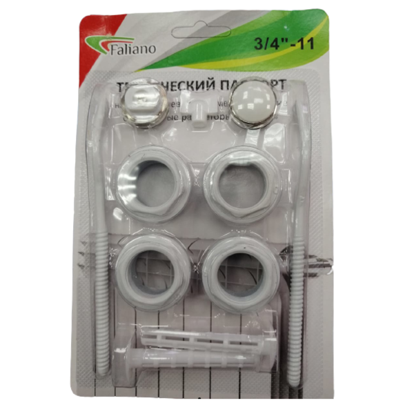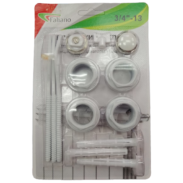 Комплект пробок 3/4 (с 2 кронштейнами) Faliano - предназначенный для монтажа алюминиевые и биметаллических радиаторов отопления с присоединительным размером 1". В комплекте 4 пробки, 2 с левой резьбой и 2 с правой резьбой, 1 заглушка, 1 воздухоотводчик и ключ для него, 2 кронштейна и дюбели для крепления радиатора к стене. Футорки снабжены силиконовыми прокладками. Кронштейны, как и футорки выполнены из оцинкованной стали, окрашены белой (RAL 9010) эпоксидной эмалью. В качестве теплоносителя в системе может применяться как вода, так и незамерзающая жидкость.