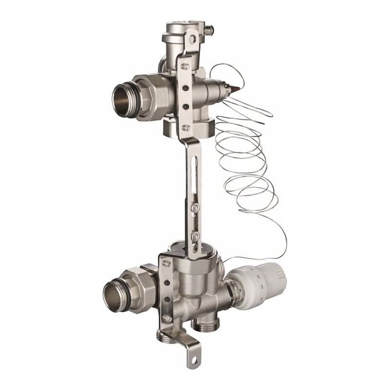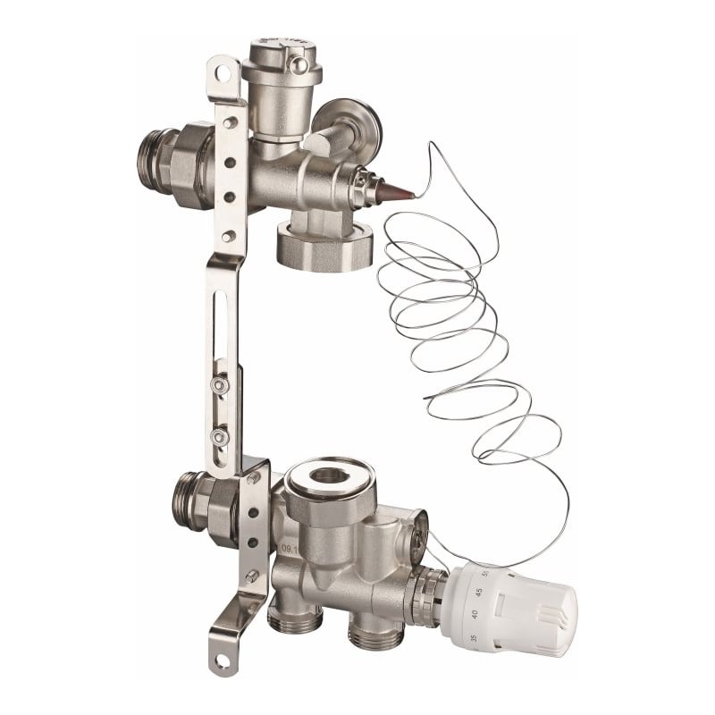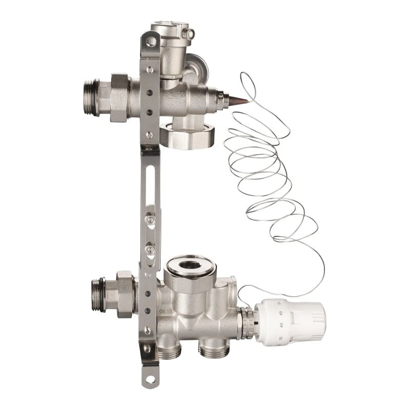 Узел состоит из гидроблока подачи теплоносителя, гидроблока-байпаса смесительного узла, автоматического воздухоотводчика, термостатической головки с выносным термо-элементом и регулируемого кронштейна.