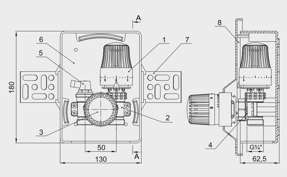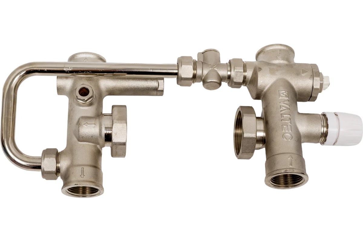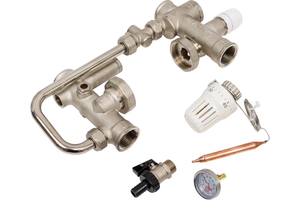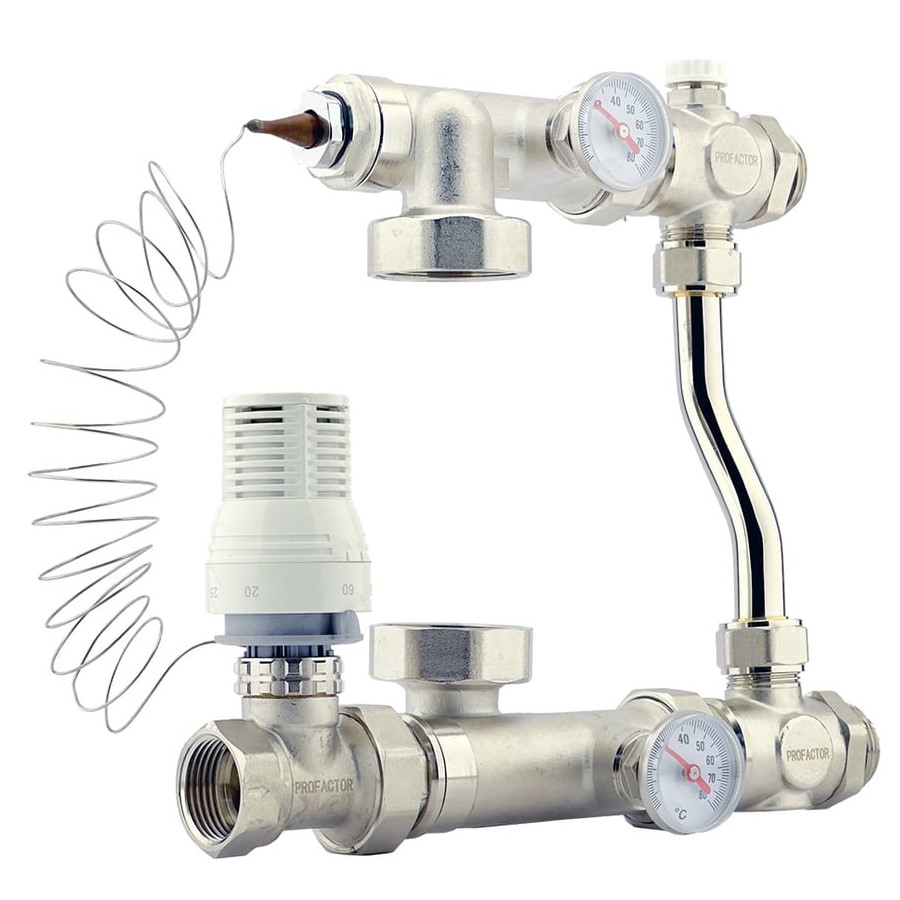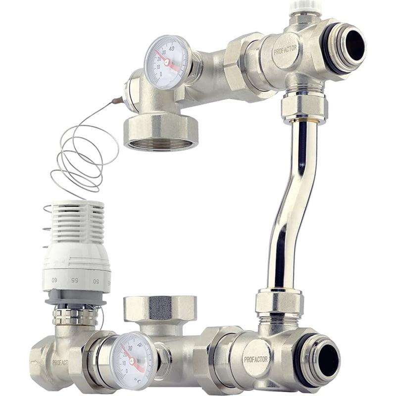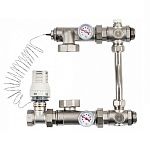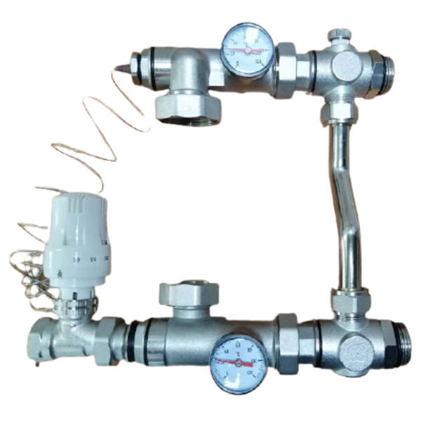 Насосно-смесительный узел предназначен для обеспечения циркуляции теплоносителя в низкотемпературных системах отопления. Температура поддерживается с помощью термостатического вентиля, который управляется термостатической головкой с погружным датчиком.